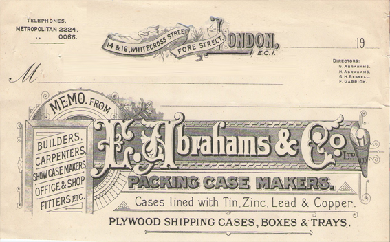E Abrahams & Co. Ltd. was founded by my wife's great grandfather in 1865. The company managed to survive the vicissitudes of two world wars and is very much alive and kicking today. The company is number one in the manufacture of cases for the fine art market.